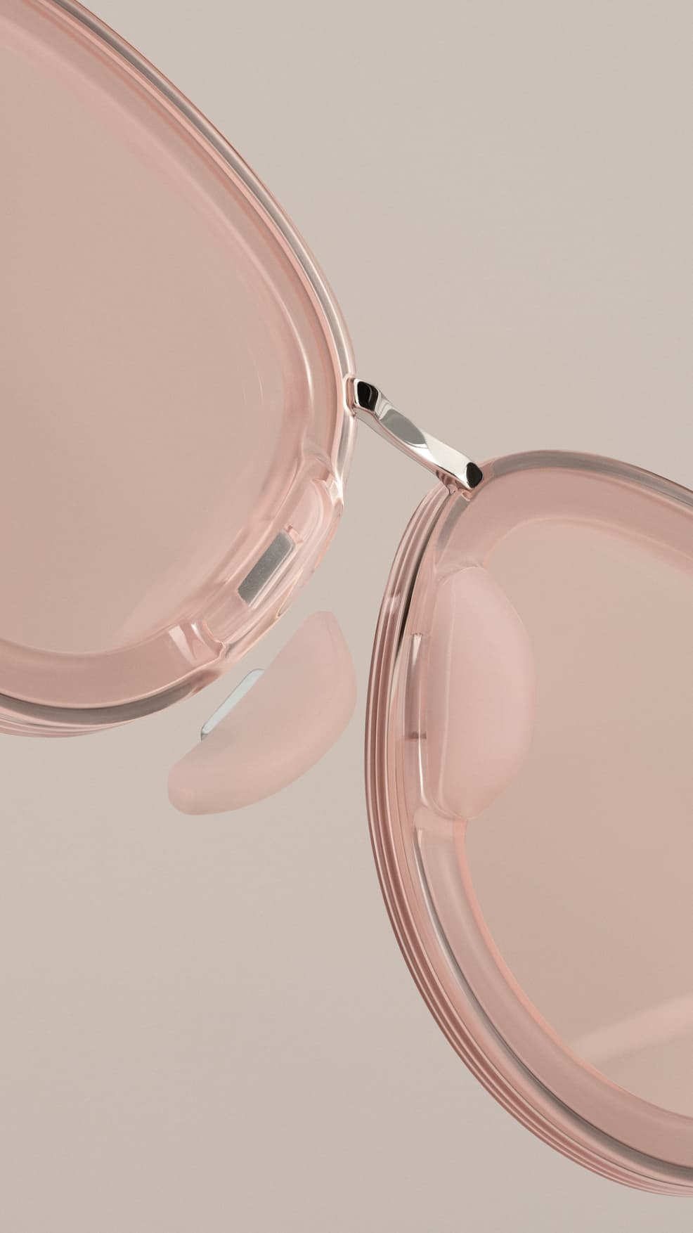 - Glossy silver stainless steel with transparent light pink acetate accents